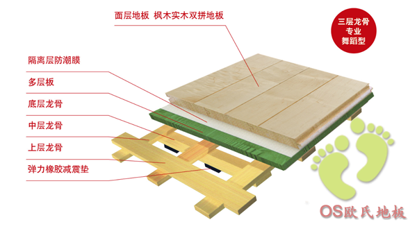 體育運動木地板—三層龍骨專業舞蹈型結構是我廠為迎合**體育地板行業的發展趨勢及時研發的專業舞臺木地板系統,它不但堅固耐用而且彈性十足,運動性能完全達到DIN標準的要求。并且具備舞臺木地板所有功能: